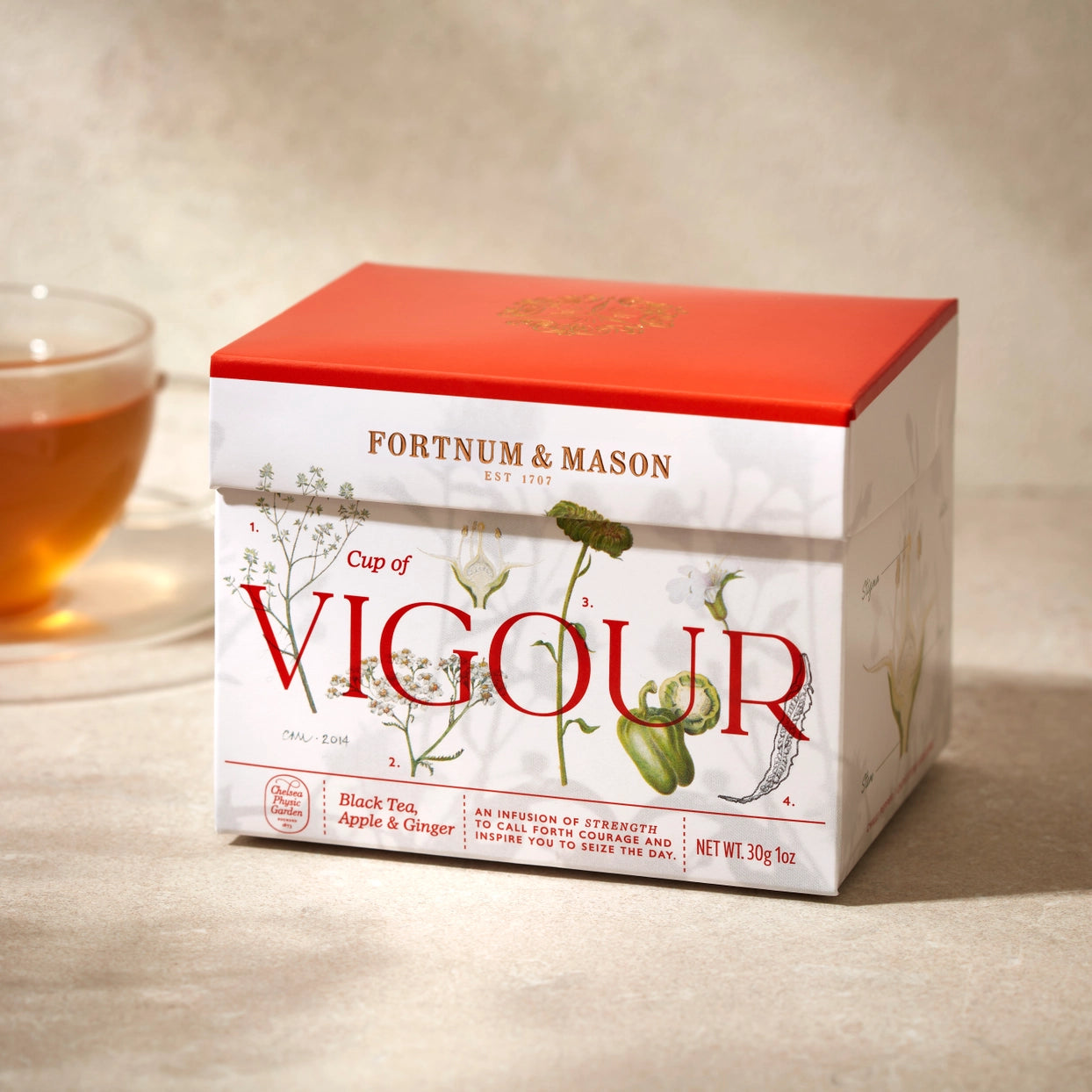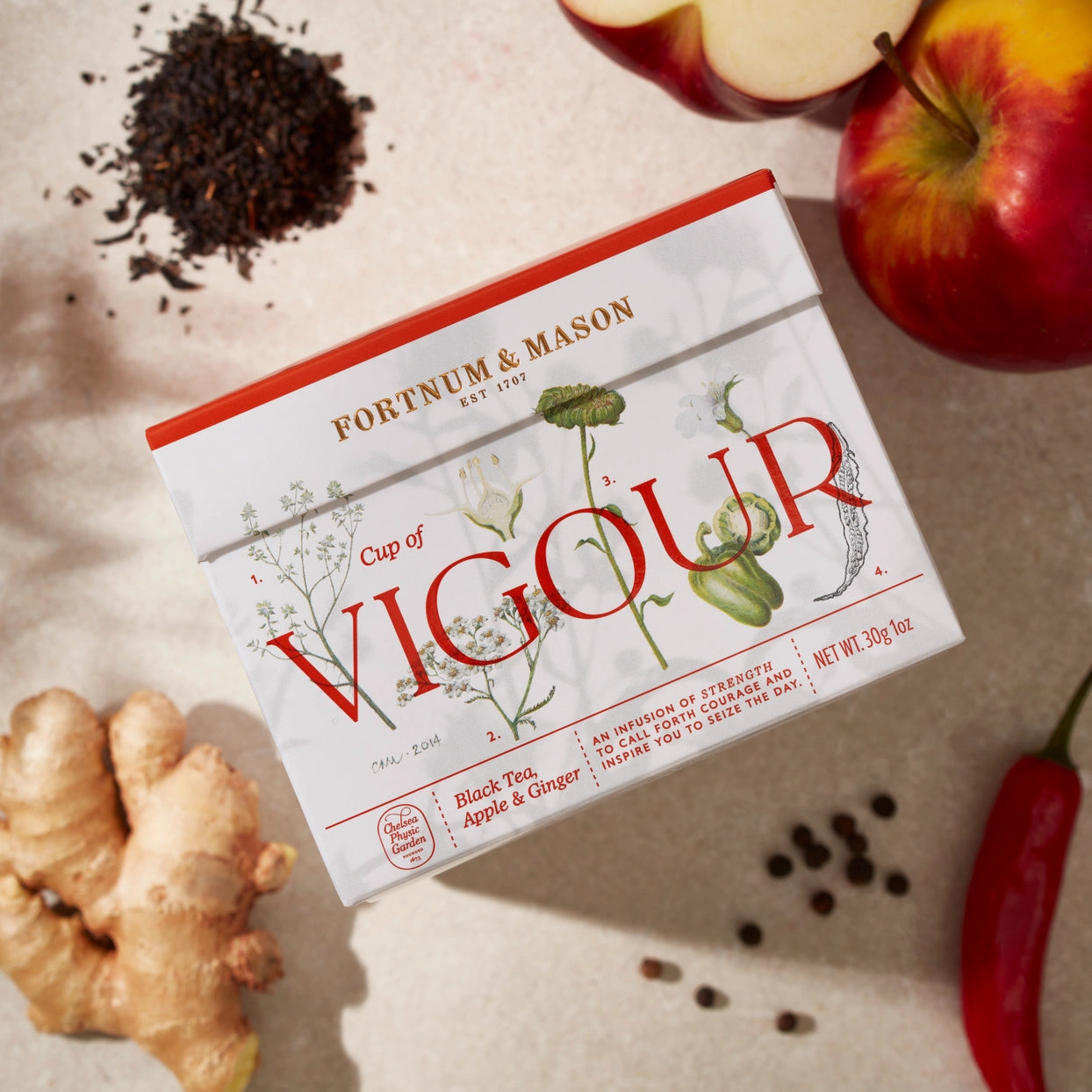 Flavour profile: A strong and heady infusion, Vigour packs a punch. Black tea forms the base of this robust blend, layered with apple and ginger – the latter valued since ancient times for its distinctive warming spice.