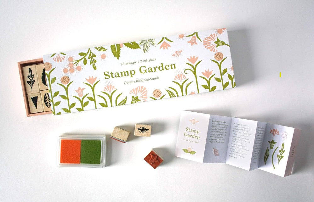 A verdant kit of parts, Stamp Garden contains all the botanically-inspired pieces you need to cultivate an imaginary garden, beautiful bouquet, or botanical pattern. With 25 wood-backed stamps in an assortment of shapes and textures, from leaves and stems to buds and petals, and two coloured ink pads.