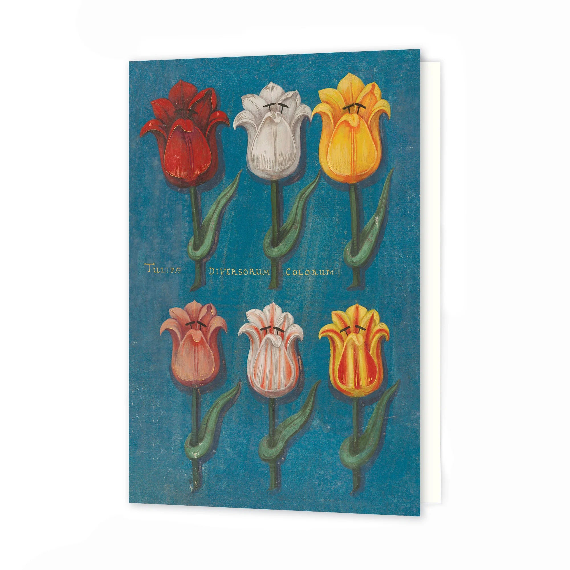 A6 greetings card featuring watercolour illustrations of flowers with a blue background, hand-painted by an unknown artist in the early 1600s onto the blank sections of pages of a christening book published in 1596 in Bavaria. Complete with a kraft paper envelope. Printed and designed in the UK using fully recyclable FSC card sourced from sustainably managed forests.